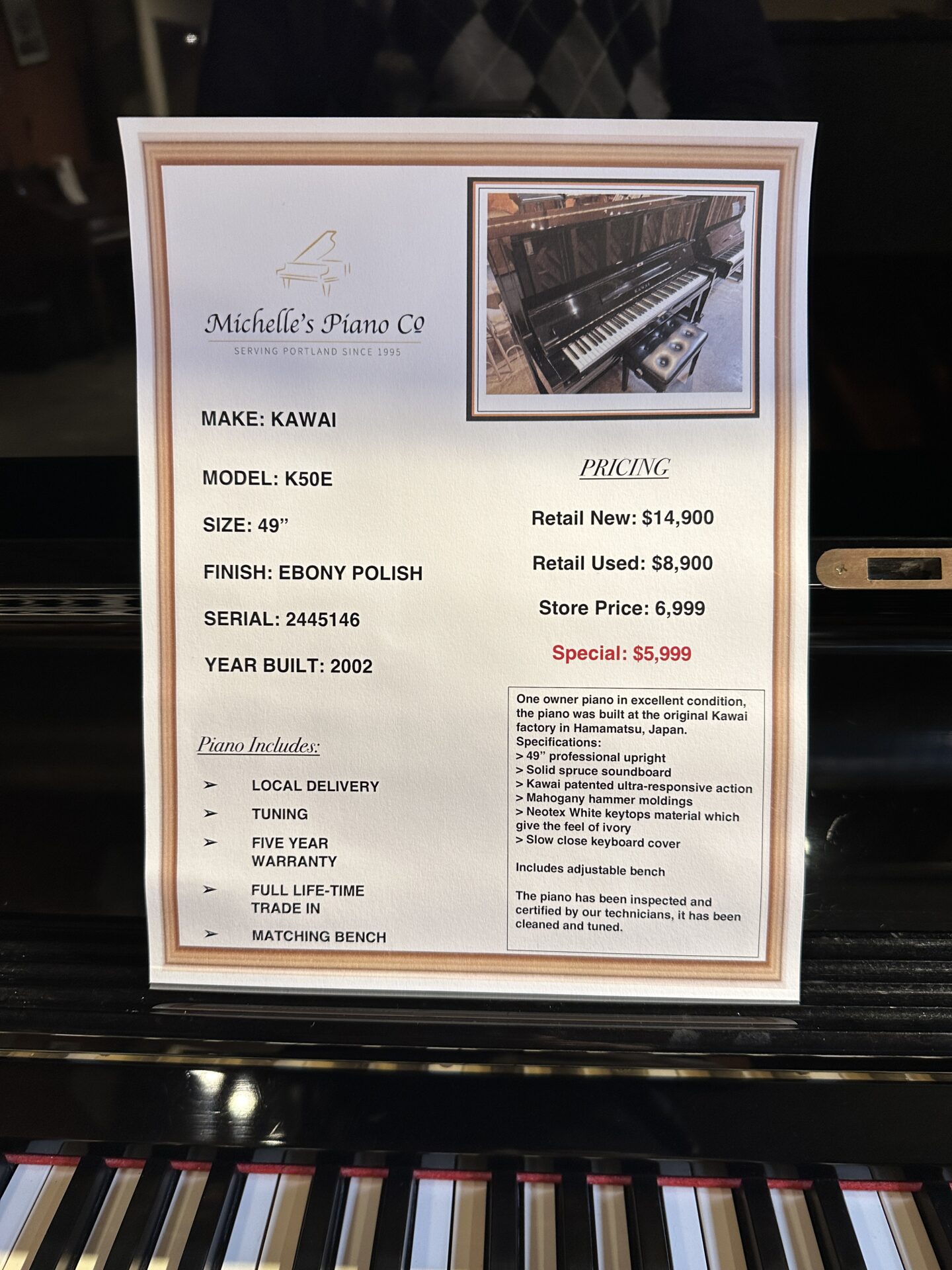 This is a one owner Kawai in excellent condition. The K50E is built at the original Kawai factory in Hamamatsu, Japan.